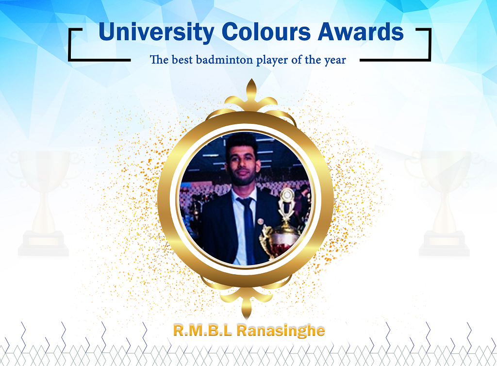 R.M.B.L Ranasinghe currently a 3rd year undergraduate of the Department of Marketing Management, University of Kelaniya is a two-year colors man who was awarded university colors in the years 2018 and 2019. He was honored as the best badminton player of the year at the University colors award ceremony