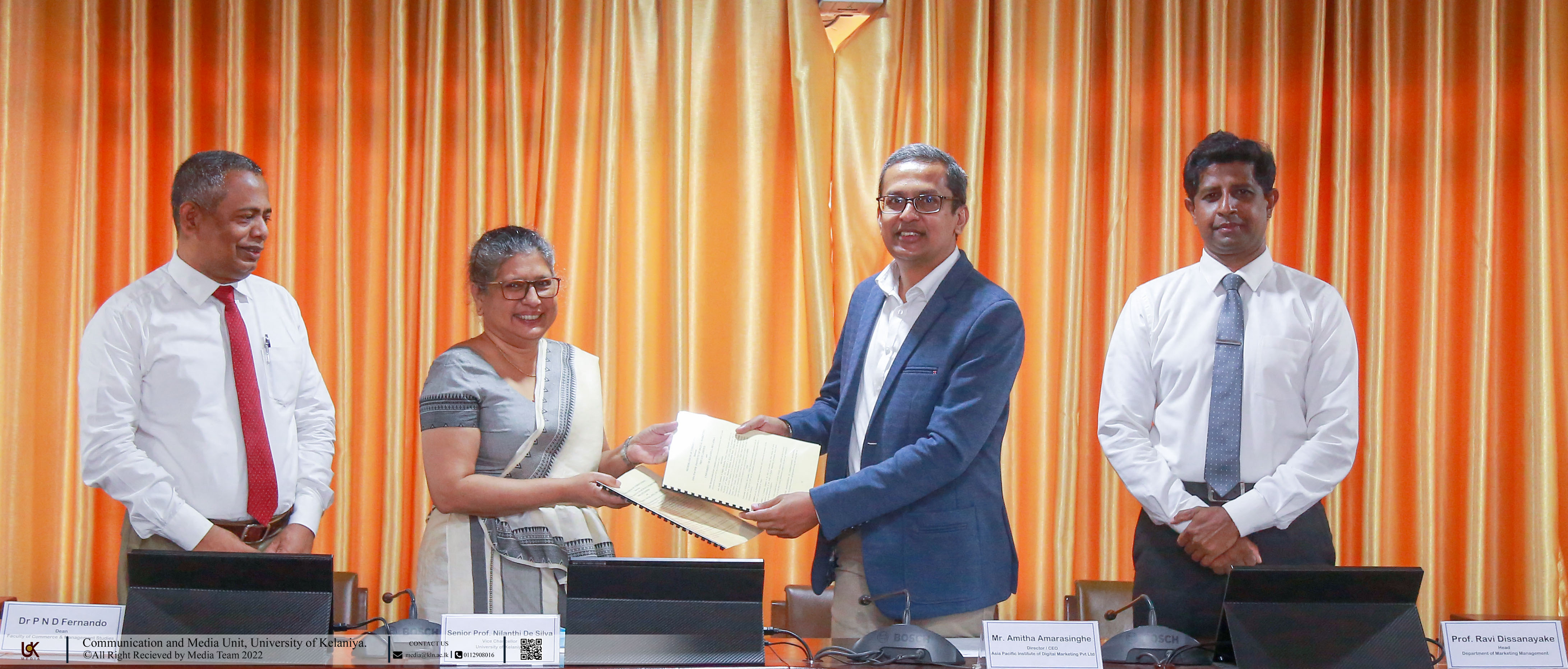 Senior Prof. Nilanthi de Silva, Vice-Chancellor - University of Kelaniya, and Mr. Amitha Amarasinghe, Director / CEO - APIDM signed the MoU on behalf of the respective organizations. Also, Dr. P. N. D. Fernando, Dean- Faculty of Commerce and Management Studies; Prof. Ravi Dissanayake, Head- Department of Marketing Management; Ms. Shareena Lantra, General Manager Operations - APIDM; other faculty members and representatives from APIDM graced the event.
