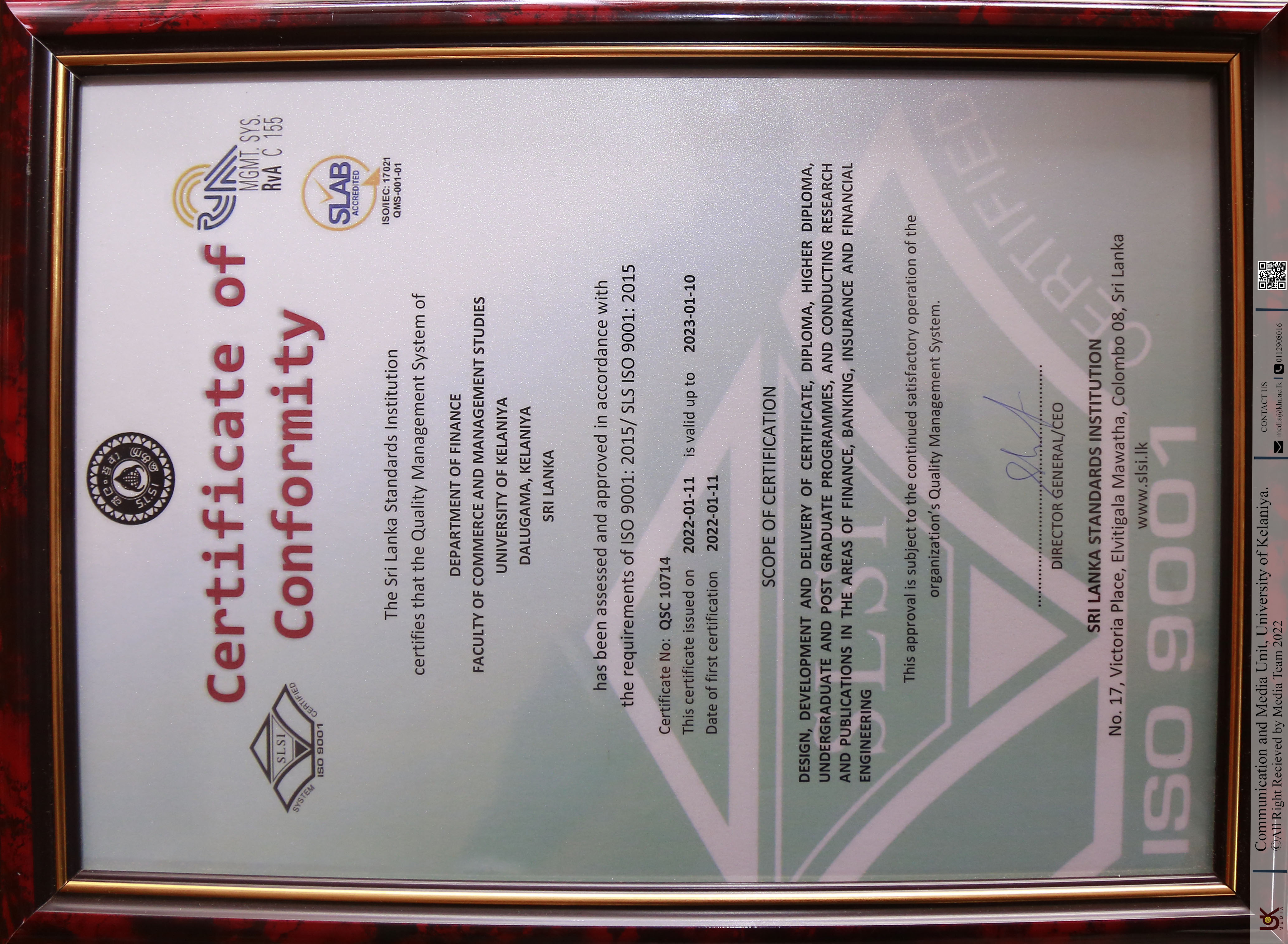 The Sri Lanka Standards Institution (SLSI) awarded the ISO 9001:2015 to the Department of Finance, University of Kelaniya on February 23, 2022 at a ceremony conducted at the Vice Chancellors' office of the University of Kelaniya. This certification is valid for three years, from January 11, 2022. The certification covers the design, development, and delivery of the Department of Finance's Undergraduate and Higher Diploma programs, as well as conducting research and publishing in the fields of Finance, Banking, Insurance, and Financial Engineering.